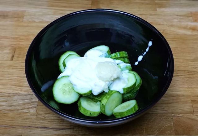 물기가 빠진 오이를 그릇에 담고 레시피의 핵심 재료인 그릭 요거트 80g 한 개를 모두 넣어준다. 여기에 다진 마늘 반 스푼과 소금 한 꼬집, 그리고 엑스트라 버진 올리브유 반 스푼을 넣고 가볍게 섞어주면 맛있는 오이 샐러드가 완성된다.