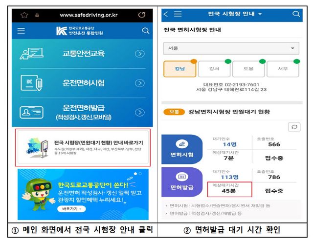 반면, 2025년 6월까지 운전면허시험장의 운전면허증 갱신 업무 대기 시간을 분석한 결과 평균 20분 정도로 지금 갱신할 경우 연말 대비 10배 이상 시간을 절약할 수 있는 것으로 나타났다. 한국도로교통공단 안전운전 통합민원 누리집에서 운전면허시험장 예상 대기 시간 현황을 확인할 수 있다.