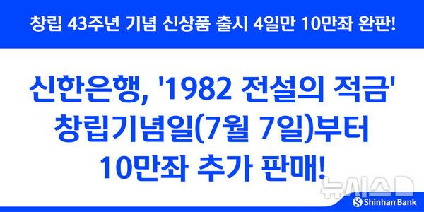 신한은행은 창립 43주년을 맞아 지난 1일 출시한 '1982 전설의 적금'이 나흘 만에 완판됐다고 6일 밝혔다. 오는 7일부터 10만좌를 추가해 재판매에 나선다.