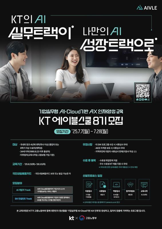 [일요시사 취재2팀] 김해웅 기자 = KT(대표이사 김영섭)가 오는 28일까지 청년 디지털 인재 양성 프로그램 KT 에이블스쿨의 8기 교육생을 모집한다고 밝혔다.