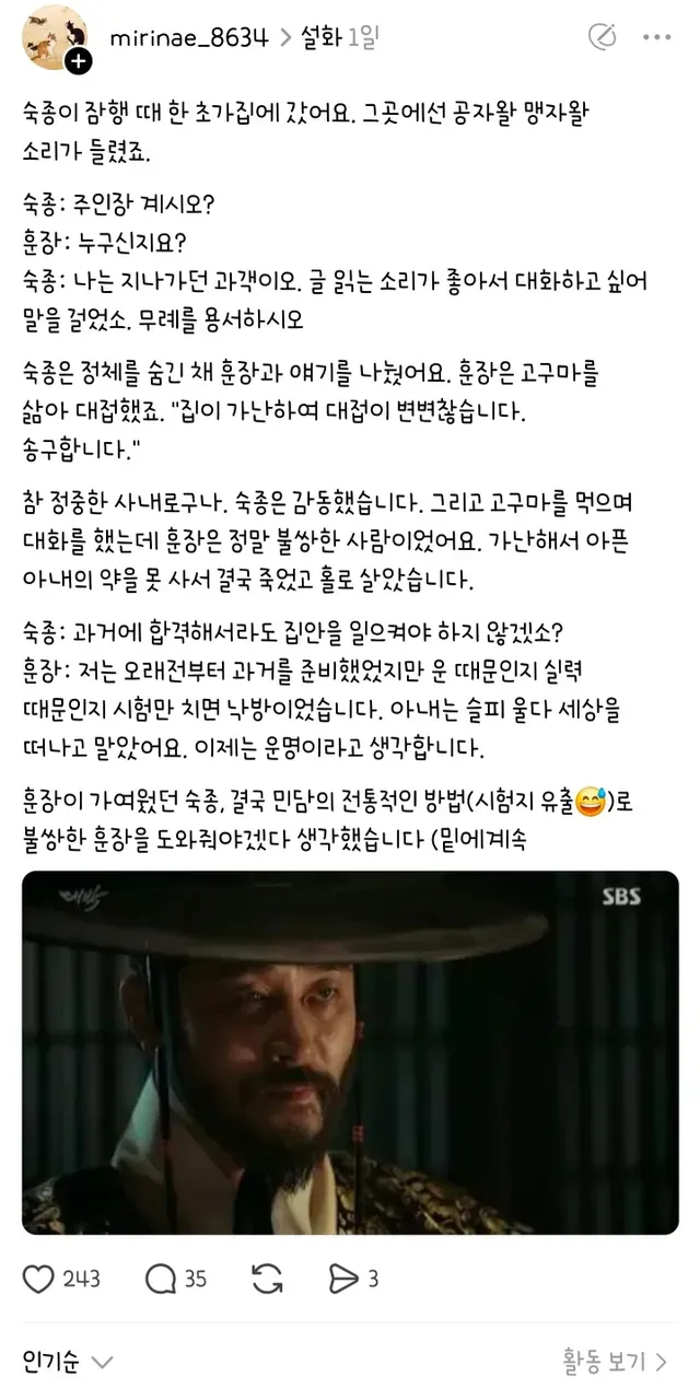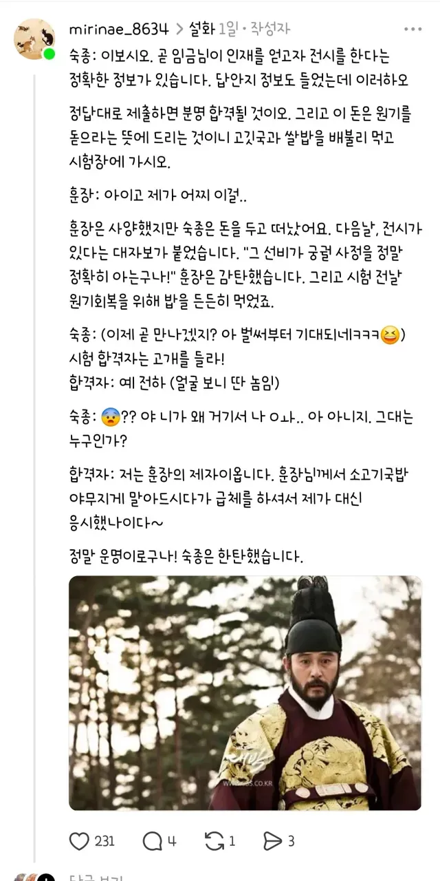숙종 잠행 때 가난한 훈장을 만나서 생긴 일,,