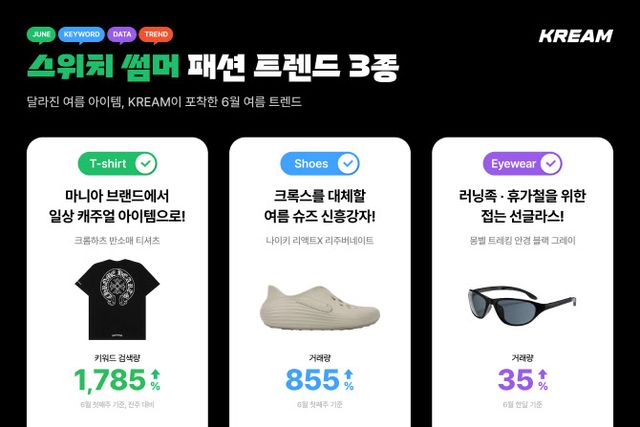 크림 관계자는 “이번 분석은 단순히 인기 제품 순위를 넘어, 데이터 기반으로 여름 소비 트렌드의 전환을 실시간 포착한 리포트”라며 “앞으로도 검색량, 저장수, 거래 데이터 등을 토대로 시즌별 인사이트를 제공해 소비자와 셀러 모두에게 의미 있는 방향성을 제시할 것”이라고 말했다.