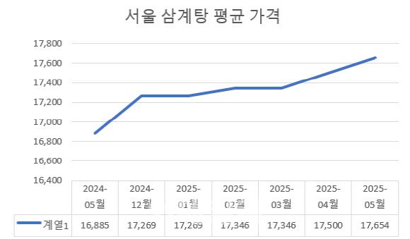 6일 한국소비자원 가격정보종합포털 ‘참가격’에 따르면, 5월 서울지역 삼계탕 평균 가격은 1만 7654원으로 전달(1만 7500원)보다 154원(0.9%) 올라 두달째 상승세를 이어갔다. 지난해 연말(1만 7269원)과 비교하면 385원(2.2%), 1년 전인 지난해 5월(1만 6885원)보다는 769원(4.6%) 올랐다.