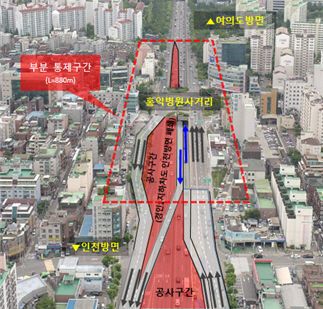 경인1지하차도 홍익병원사거리 차로가 줄어든다. 국회대로 지하화와 상부 공원화 공사의 일환이다.