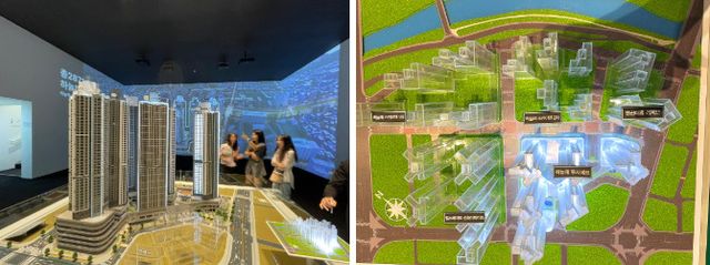 (왼)안쪽에는 단지 배치와 외관을 실물처럼 구현한 대형 모형도가 마련돼 관람객들의 이해를 도왔다. (오)선화동 일대에 조성 중인 4700여 세대 규모 초고층 브랜드 타운 모형도. = 박선린 기자