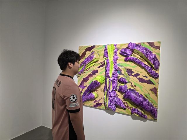 축구유니폼을 입은 청소년이 김한나 작가의 작품을 감상하고 있다.(사진=뉴스영)