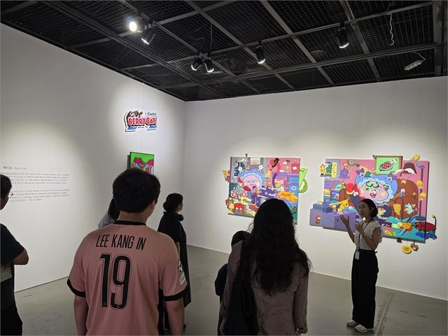 전시해설사가 2025 성남의 얼굴전 '무해한 이야기' 기획전시실에서 베리킴 작가의 그림을 관람객들에게 설명하고 있다.(사진=뉴스영)