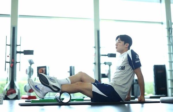 밝은 표정으로 홋스퍼 웨이(토트넘 훈련장)에 도착한 양민혁은 폼롤러를 활용해 몸을 풀며 복귀 첫 훈련을 소화했다.