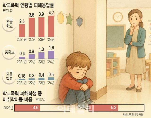 지난해 교육부 ‘학교폭력 실태조사 결과’에 따르면 초등학생의 학교폭력 경험 비율이 증가세를 보이고 있다. 2021년 2.5%였던 이 비율은 △2022년 3.8% △2023년 3.9% △2024년 4.2% 등으로 점차 늘고 있다. 학교폭력 피해를 입은 중학생이 1% 안팎, 고등학생이 0%대에 머무르는 것을 고려하면 높은 수치다. 즉, 학폭이 점차 저연령화하고 있는 추세를 보여주는 것이다.