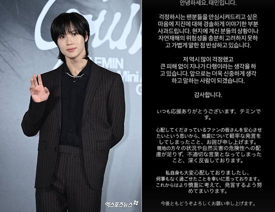 (엑스포츠뉴스 김예나 기자) 그룹 샤이니의 멤버 태민이 일본 지진과 관련한 경솔한 발언에 대해 사과했다. 하지만 그의 사과문을 두고도 의견이 엇갈리며 논란이 이어지고 있다.