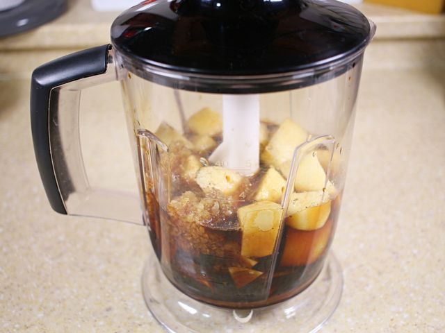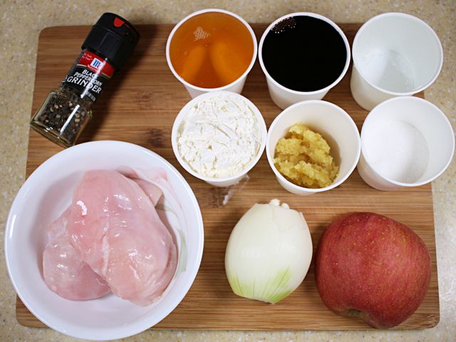 재료는 닭가슴살, 양파, 사과, 간장, 올리고당,