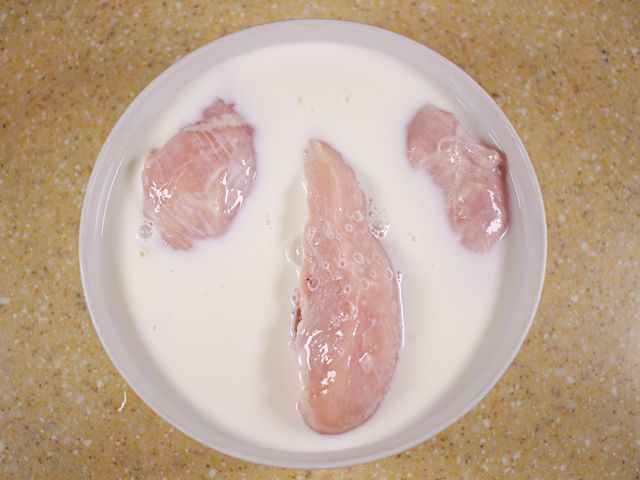 닭가슴살을 우유에 20분 담가 잡내를 제거해요.
