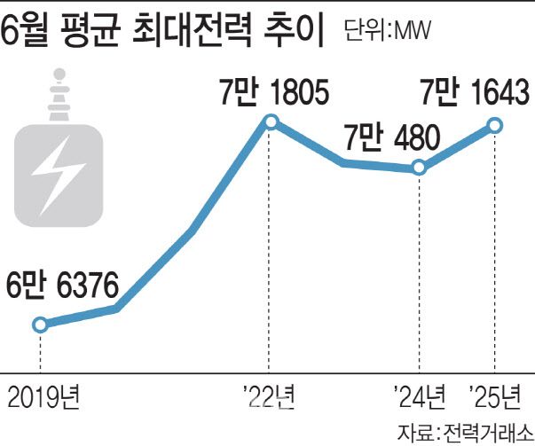 일찍 찾아온 무더위에 에어컨 등 가정과 기업의 가전기기 사용량이 늘어났다는 뜻이기도 하다. 기상청에 따르면 올 6월 평균기온은 22.9도로 지난해(22.7도)보다 높은 역대 최고치를 기록했다. 폭염·열대야 일수도 역대 2위를 기록했다.