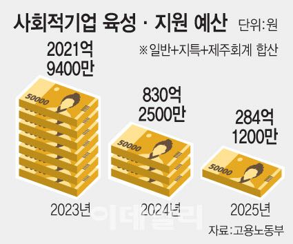 사회적기업 예산은 2023년 2022억원에서 올해 284억원으로 2년 만에 86% 삭감됐다. 이 가운데 특히 사회적기업가 육성 예산(일반+지특+제주회계)이 2023년 1329억원에서 올해 0원으로 순감됐다. 정부는 내년 예산을 1000억원 대로 늘린 뒤 윤 정부 이전 수준까지 단계적 복원이 필요하다고 보고 있다.