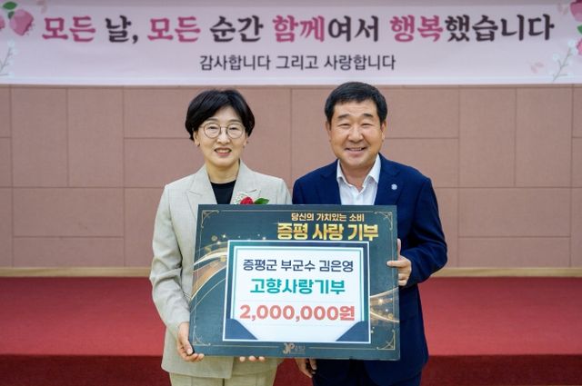 [파이낸셜경제=김영란 기자] 충북 증평군은 김은영 前 증평 부군수가 퇴임 후에도 증평을 잊지 않고 고향사랑기부금 200만원을 기탁했다고 7일 밝혔다.