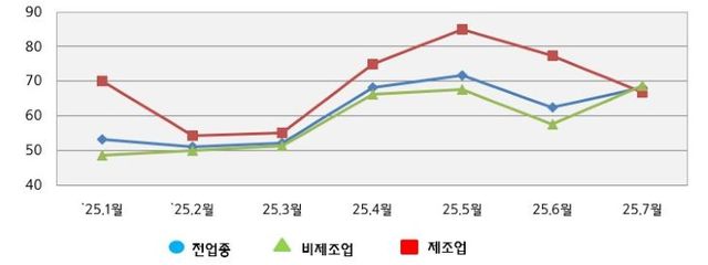 중소기업중앙회 제주지역본부가 7일 발표한 '2025년 7월 중소기업경기전망조사'에 따르면 이달 업황전망 중소기업건강도지수(SBHI)는 68.1로 전월대비 5.6p(포인트) 상승한 것으로 조사됐다. 이번 조사는 지난달 11일부터 17일까지 도내 47개 중소기업을 대상으로 실시됐다.