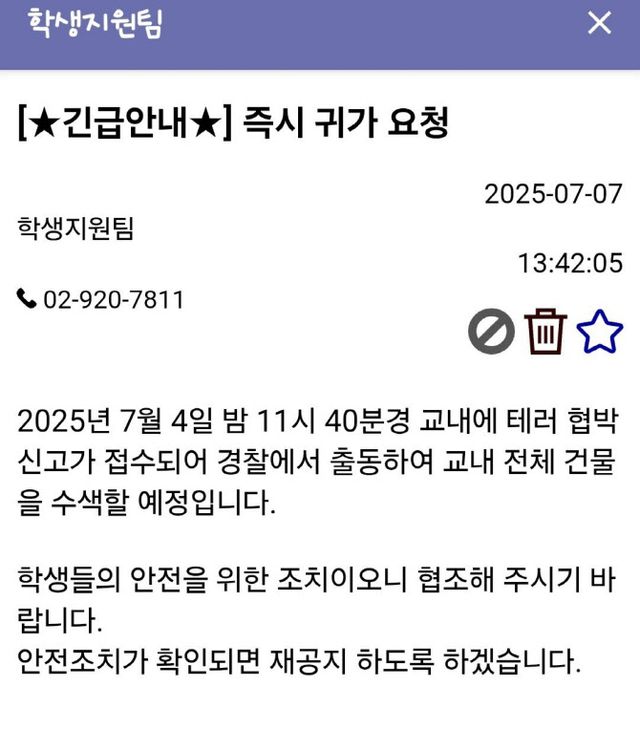 이날 오후 학교 측은 학생들과 교직원 등을 상대로 테러 협박 사실을 알리고 출입 금지를 공지했다. 이 학교 학생인 김모(24)씨는 “학교에 가던 중 테러 협박 때문에 학교에 오지 말라는 전화를 받았다”고 말했다.