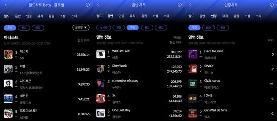 세계 유일의 실시간 음악차트인 한터차트는 7일 오전 10시 2025년 7월 1주 차 주간차트를 발표했다.