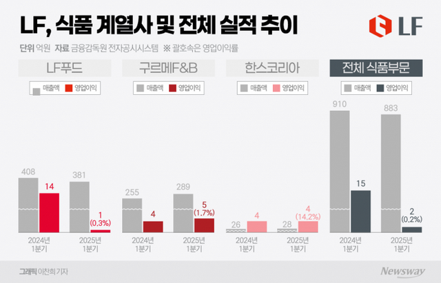 특히 LF푸드는 주요 식품 계열사 중에서도 실적이 좋지 않았다. 1분기 LF푸드의 매출은 381억원으로 식품 부문에서 가장 컸지만, 영업이익은 지난해 동기(14억원)보다 93% 줄어든 1억원을 기록했다. 같은 기간 구르메F&B와 한스코리아는 각각 영업이익 5억원, 4억원을 올렸다.