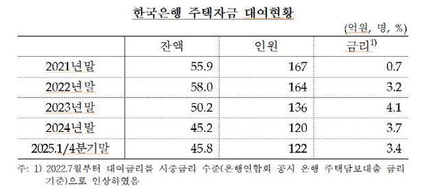 7일 국회 기획재정위원회 소속 차규근 의원(조국혁신당)이 한국은행으로부터 제출받은 자료에 따르면 한은은 올해 1분기 말 기준 직원 112명에게 총 45억 8000만원의 주택자금대출을 제공했다. 1인당 평균 대출 금액은 약 3800만원, 적용 금리는 연 3.4% 수준으로 같은 기간 시중은행 평균 대출 금리(신규취급액 기준)인 4.2%보다 0.8%포인트 낮다.