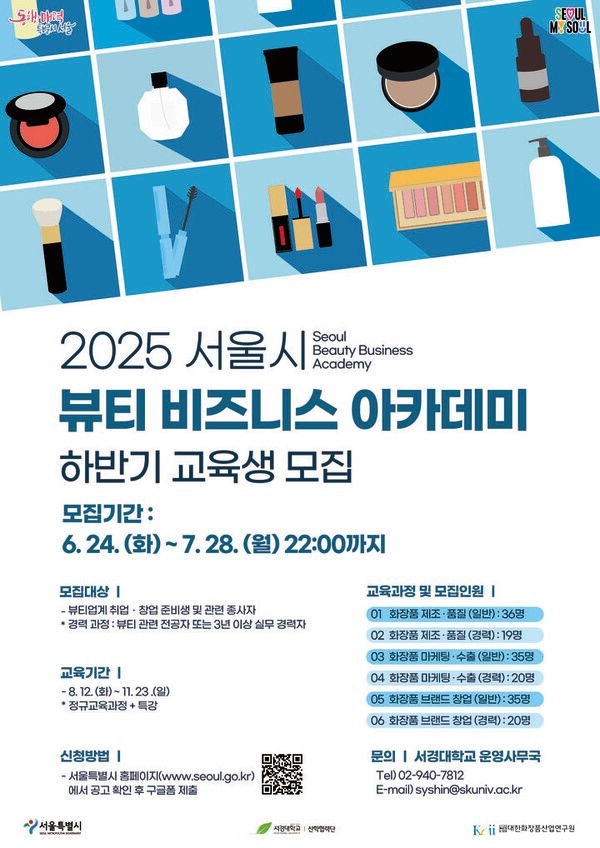 뉴시스 보도에 따르면, '2025 서울시 뷰티 비즈니스 아카데미'는 뷰티 산업 종사자 및 예비 창업자, 취업 준비생들을 위한 실무 중심의 교육 프로그램으로 서울시가 주관하고 서경대 산학협력단과 (재)대한화장품산업연구원이 공동 운영하고 있다.