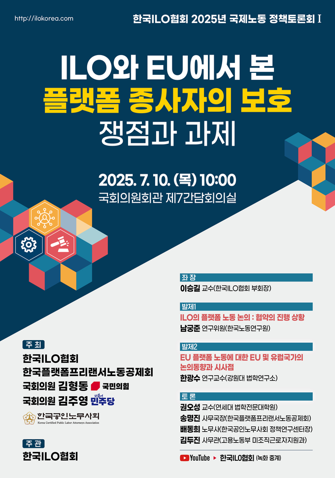 [와이뉴스] 한국 ILO협회 2025년 국제노동 정책토론회Ⅰ이 'ILO와 EU에서 본 플랫폼 종사자의 보호 쟁점과 과제'를 주제로 오는 7월 10일 오전 국회의원회관 제7간담회의실에서 열린다.
