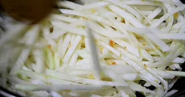 조리법은 단순하다. 무는 손가락 두 마디 길이로 썰고, 두께는 약간 얇게 채 썬다. 팬에 들기름을 두르고 중불에서 무를 볶기 시작한다. 소금 약간으로 간을 맞추고 무가 투명해질 때까지 볶다가, 물이나 쌀뜨물을 반 컵쯤 붓고 뚜껑을 덮어 중약불에서 잠깐 더 익힌다. 이때 너무 센 불을 쓰면 무가 금방 흐물해져 식감이 줄어들 수 있으니 천천히 숨이 죽도록 조리하는 것이 좋다.