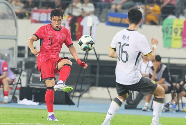 이날 홍명보 감독은 2026 국제축구연맹(FIFA) 북중미 월드컵 예선과 다르게 백스리 시스템을 가동하며 변화를 줬다. 포백 라인에서 측면 수비를 맡았던 이태석도 한 칸 전진해 평소와 다른 임무를 수행했다.