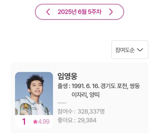 7일 아이돌차트는 임영웅이 6월 30일부터 7월 6일까지 집계된 6월 5주 차 평점랭킹에서 32만 8,337표를 받아 최다득표를 기록했다고 밝혔다.