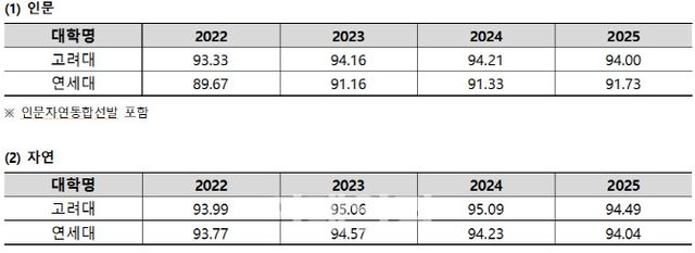 분석 결과 2025학년도 대입 정시 기준 고려대 인문계열 합격점은 94점으로 연세대(91.73점)를 앞선 것으로 나타났다. 자연계열 역시 고려대 합격점(94.49점)이 연세대(94.04점)보다 높았다.