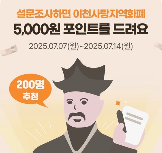 이천시는 설문 응답자 가운데 200명을 추첨해 이천사랑지역화폐 5,000원을 지급하고, 설문조사 참여 점주 300명에게는 3,000원을 지급하는 이벤트도 함께 진행한다. 경품 지급 및 추첨은 설문조사 플랫폼 기관인 ‘코나체인’에서 담당한다.