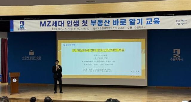 수원시는 7일 수원시 평생학습관에서 시민을 대상으로 ‘MZ세대 인생 첫 부동산 바로 알기 교육’을 했다. 강의를 안 이승주 공인중개사는 ‘꼭 알아야 할 부동산 계약 기초 상식’을 주제로 집을 구하기 전부터 입주하기까지 과정별로 유의해야 할 사항을 설명했다.