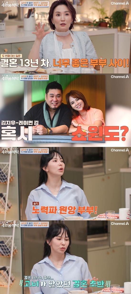 박경림은 "의혹이 하나 있다. '결혼 13년 차가 이렇게까지 사이가 좋을 수 있냐. 쇼윈도 아니냐'라는 의혹이 있다"라며 김지우에게 남편과 사이가 좋은 비결을 질문했다.