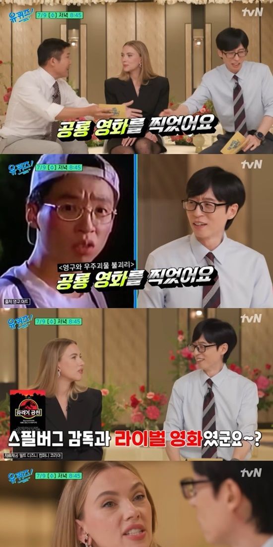 (엑스포츠뉴스 김유진 기자) 할리우드 배우 스칼렛 요한슨이 '유퀴즈'에서 유재석과 조세호를 만나 유쾌한 입담을 선보이며 방송 속 활약을 기대케 했다.