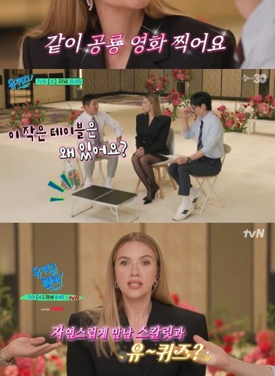스칼렛 요한슨은 자신의 앞에 놓인 작은 테이블을 바라보며 "이 작은 테이블은 왜 있냐"고 물었고, 유재석과 조세호의 "유퀴즈?" 물음에 "Yes"라고 화답하며 본방송에서 공개될 퀴즈 풀이에도 관심을 더했다.
