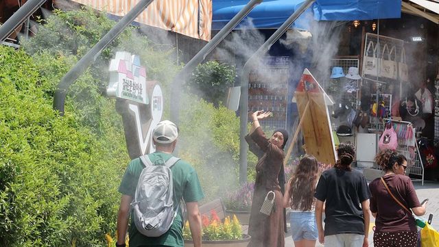 연일 열대야와 폭염이 이어지는 가운데 8일 오후 부산 사하구 감천문화마을에서 외국인 관광객들이 쿨링 포그가 뿜어내는 물안개를 맞고 있다. / 연합뉴스