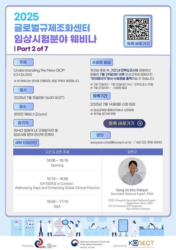 뉴시스 보도에 따르면, 식품의약품안전평가원은 오는 15일 국내외 임상시험 산·학·관 관계자 대상으로 개정된 ICH 임상분야 가이드라인을 안내하는 온라인 국제교육프로그램(웨비나)을 개최한다고 8일 밝혔다.
