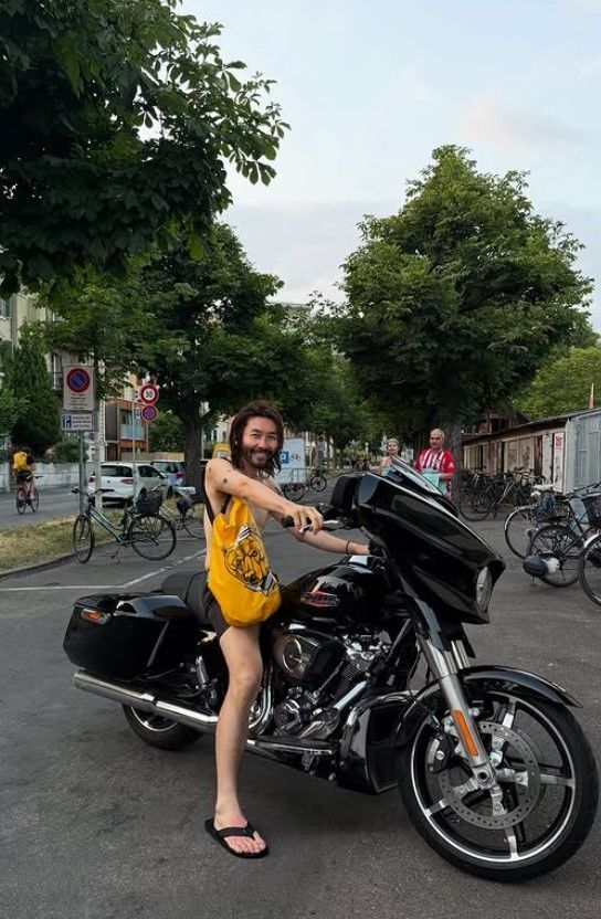 사진 속 노홍철은 스위스 길거리를 배경으로 대형 오토바이에 올라탄 채 환하게 웃고 있다.