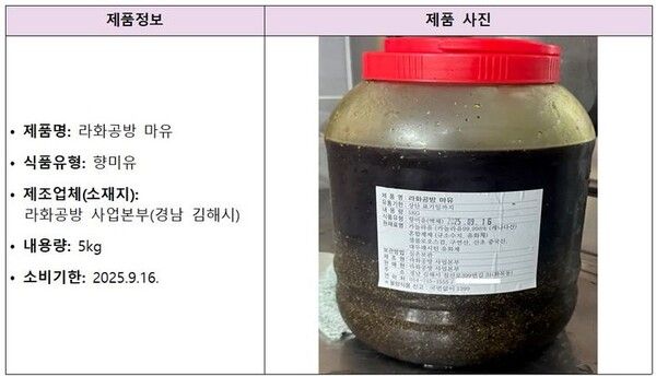 해당 제품은 경남 김해시에 위치한 식품제조·가공업체인 '라화공방 사업본부'가 제조 및 판매했다.