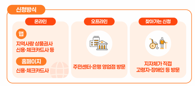 신청자는 정부24, 복지로 등 정부 공식 플랫폼, 또는 국민·농협·신한카드 등 카드사 앱을 통해 접수할 수 있다. 일부 지자체는 지역 복지포털 또는 행정복지센터(동사무소) 방문 접수도 병행한다.