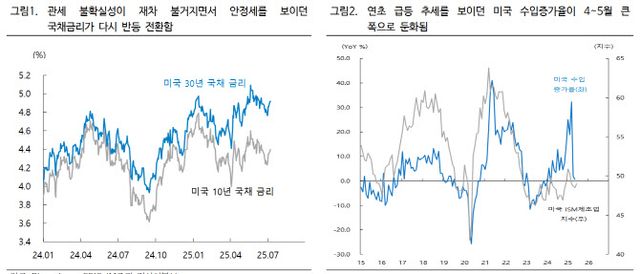 국채 금리 또한 살펴봐야 한다는 조언이다. 최근 관세 불확실성이 다시 불거지면서 하향 안정 추세를 보이던 국채 금리가 다시 반등하는 모습을 보이고 있고, ‘크고 아름다운 하나의 법안 법(OBBBA)’ 감세안이 의회를 통과하면서 재정리스크가 잠재해 있어, 국채 금리가 다시 요동칠 위험이 잠재해 있다는 분석이다.