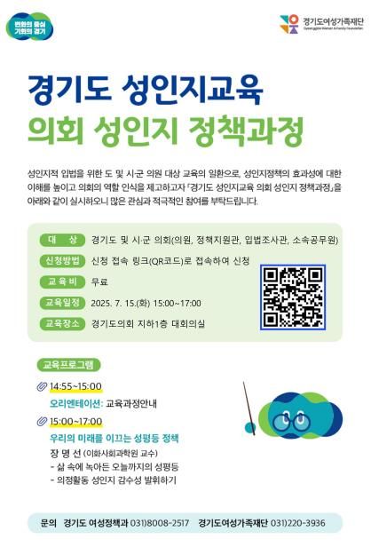 경기도는 매년 도 공무원과 의회, 시군, 공공기관 직원을 대상으로 다양한 성인지력 향상 교육 프로그램을 운영하고 있다. 올해 상반기에는 1천여 명의 공무원이 참여했으며, 하반기에는 공공기관 직원을 대상으로 한 성인지 교육과 더불어 성인지적 관점을 적용한 홍보 제작 교육도 이어갈 계획이다.