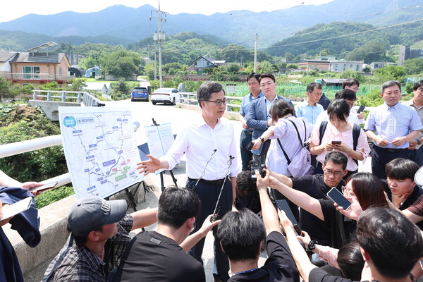 '김건희 특검팀'(민중기 특별검사)가 '서울-양평 고속도로 특혜 의혹' 수사를 본격화 한 상황에서 김 지사는 이날 오후 서울-양평 고속도로 원안 종점에 해당하는 양평군 양서면 청계리를 찾았다.