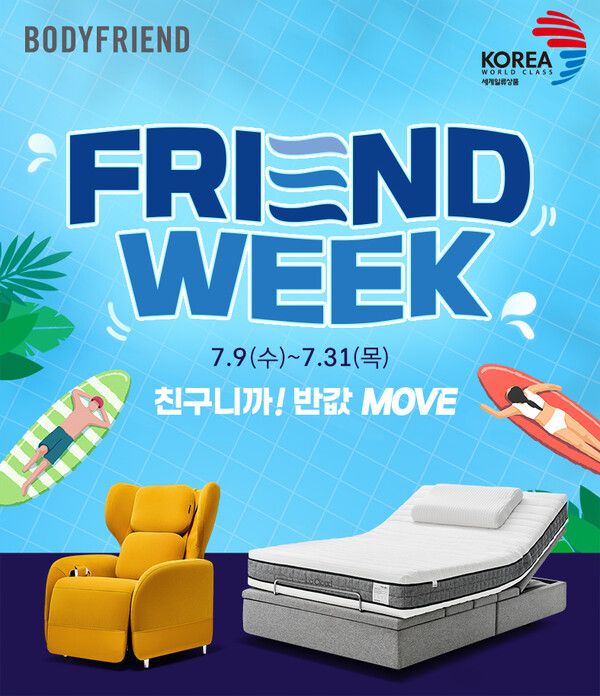 이번 프로모션은 매년 7월 9일경 바디프랜드 사명인 '친구(Friend)'와 연관이 깊은 날짜(7월 9일)를 연결하여 진행하는 바디프랜드 만의 특별한 브랜드 행사다. 올해 프랜드위크 대상 제품은 신제품 마사지소파 파밀레 시리즈 중 하나인 ‘파밀레C’, 혁신적인 슬립테크 기술력으로 최근 급변하는 라이프스타일에 최적화된 모션베드 브랜드 라클라우드의 ‘헬스모션’과 ‘EZ모션’이다.