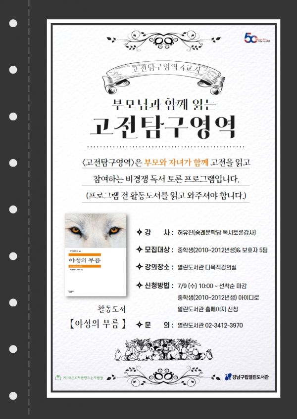 강남구립열린도서관에서 7월 27일 청소년과 부모님이 함께하는 독서토론 프로그램 ‘고전탐구영역’을 진행한다.