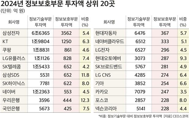 기업별로 지난해 정보보호 부문에 1000억원 이상 투자한 회사는 삼성전자(3562억원)와 KT(1250억원) 두 곳에 불과하다.