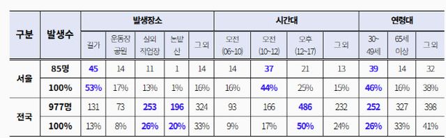 서울시 온열질환자 발생 양상은 발생 장소, 시간대, 연령대 등에서 전국과 차이가 있다. 서울에서 온열질환은 작업장보다 길가, 운동장, 공원 등 야외 여가활동 공간에서, 오후보다는 오전(10시~12시)에, 노년층보다는 30~40대 청장년층에서 더 많이 발생했다.