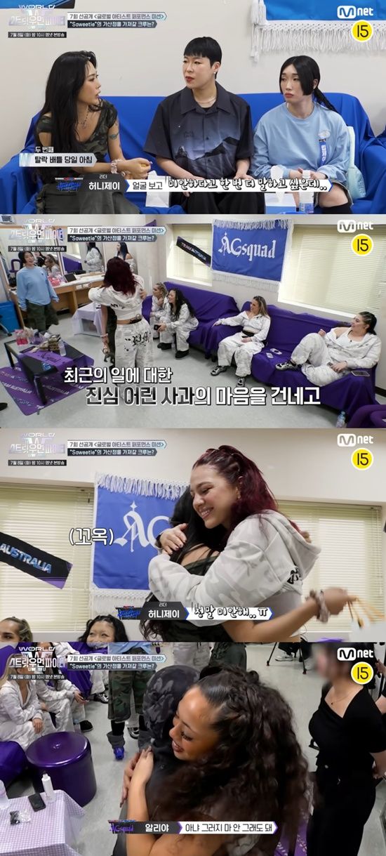 영상에는 탈락 배틀을 앞두고 팀 범접의 허니제이와 아이키 등이 AG스쿼드 크루 대기실을 찾아 사과하는 장면이 담겼다.