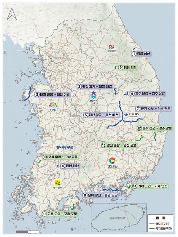 뉴시스 보도에 따르면, 국토교통부는 지방도 등 14개 노선을 오는 11일부로 일반국도 및 국지도로 승격 지정한다고 9일 밝혔다.