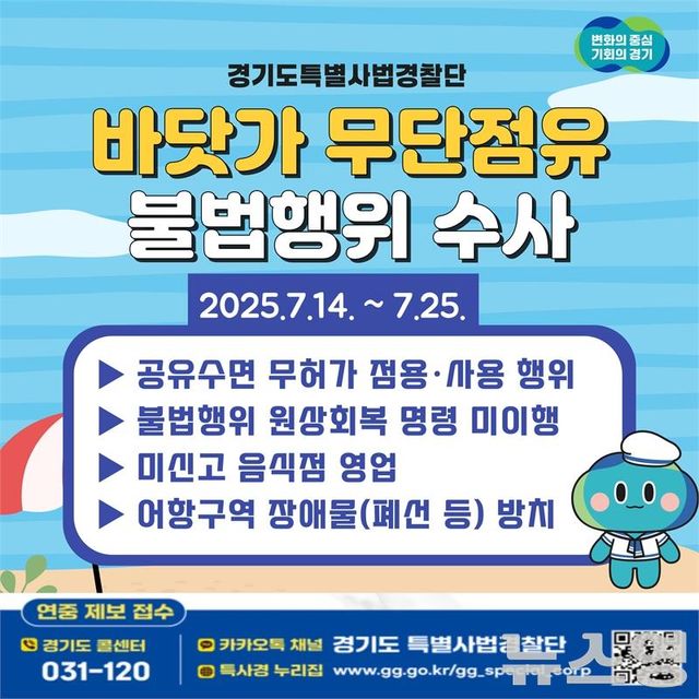 (뉴스영 이현정 기자) 경기도가 여름 휴가철을 맞아 도민이 많이 찾는 바닷가 주변 무단점유 행위 근절을 위해 오는 14일부터 25일까지 불법행위를 집중 단속한다.